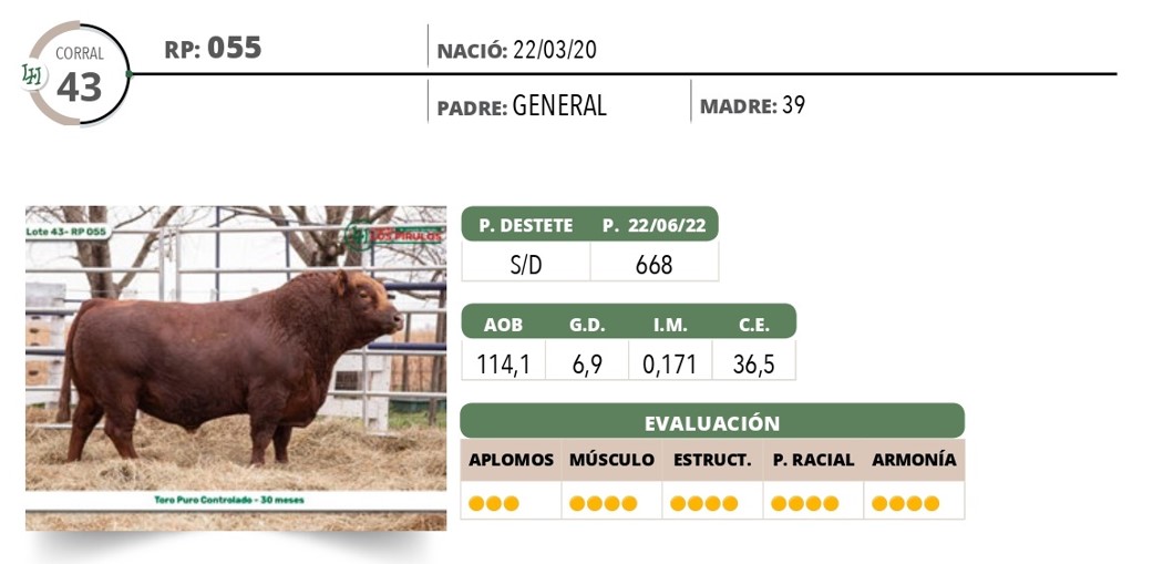 LOTE 43 - RP 055, TOROS PUROS CONTROLADOS - 22/24 meses Lote Anterior Volver al remate Lote Siguiente Información del Lote Animal Pedigree Ofertar Contacto Buenos Aires - Salliquelo. - Buenos Aires. Información del Lote Identificador: #169812 Categoría Toros PC Certificado 43 Departamento Buenos Aires Ubicación Salliquelo. - Buenos Aires. Buenos Aires - Salliquelo. - Buenos Aires. Ofertar Fecha de cierre: 10 de Agosto a las 22:00hs. Aún no tiene ofertas Animales: 055 Plazo: Contado 30 días 45 días 60 días 90 días 120 días 180 días 2 Cuotas (30 y 60 días) 3 Cuotas (30, 60 y 90 días) 4 Cuotas (30,60,90 y 120 días) Su Oferta en $: − + Step: -20.000,00 / +20.000,00 Programar puja hasta: Programar puja hasta Aumentar puja programada 440000 800000 **Oferta al bulto Iniciar sesión para ofertar Ofertar Compra por $ 99.000.000,00 Ofertas Recibidas $ Fecha/Hora Estado Este lote aún no tiene preofertas. ¿Estás seguro de comprar el LOTE TOROS PUROS CONTROLADOS - 22/24 meses por $ 99000000 ? 30 Visualizaciones ClicData Animal RP 055 PADRE GENERAL MADRE 39 NAC 22/3/2020 CE 36,5 PF 668 PD S/D AOB 114,1 PRECIO BASE 0.00 RP 055 PADRE GENERAL MADRE 39 NAC 22/3/2020 CE 36,5 PF 668 PD S/D AOB 114,1 PRECIO BASE 0.00 Pedigree Contacto Empresa: Cabaña Los Pirulos Nombre*: E-mail* : Mensaje Enviar Registrese gratis Este contenido Exclusivo está disponible sólo para usuarios registrados Ingresar