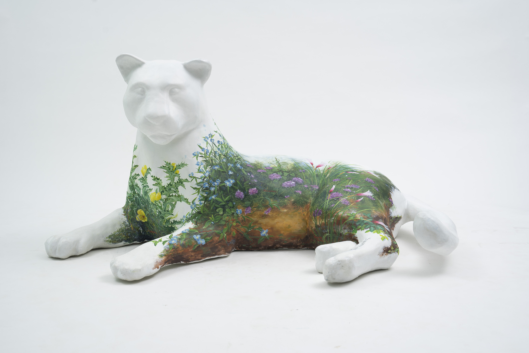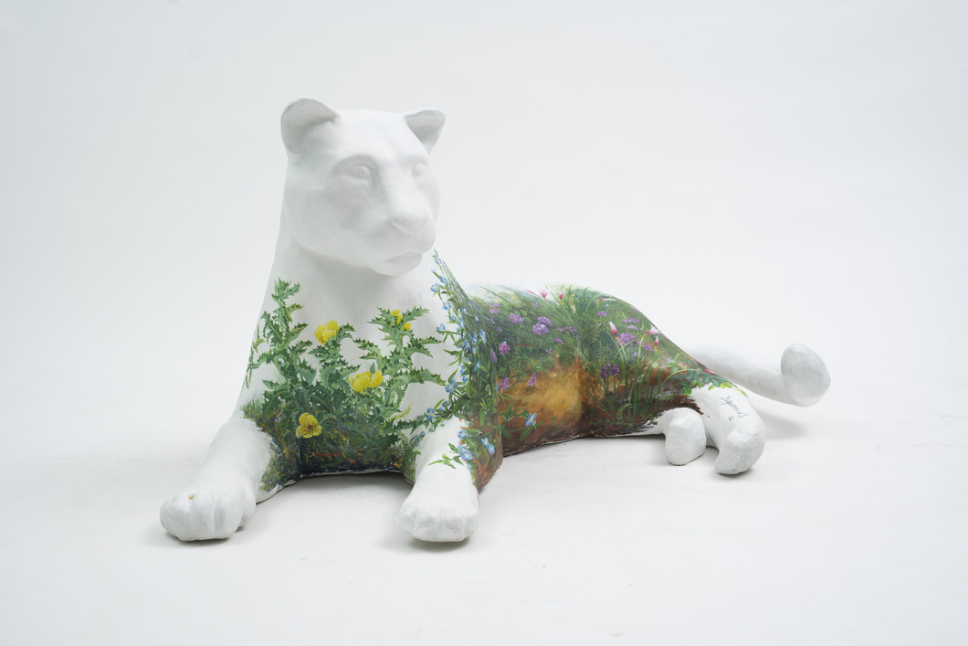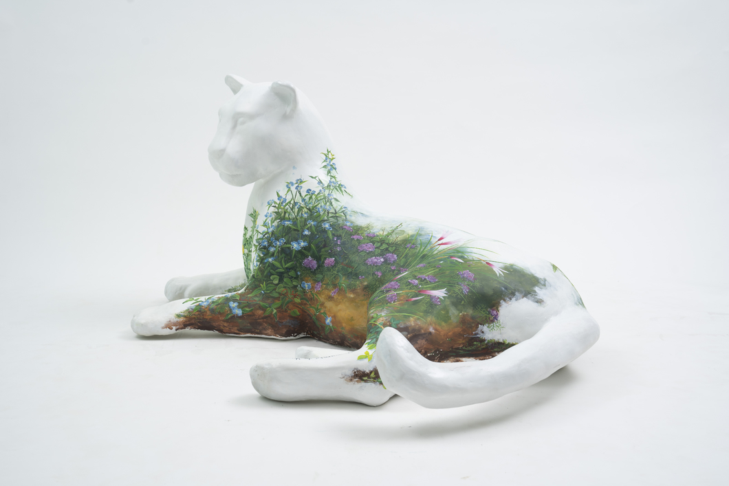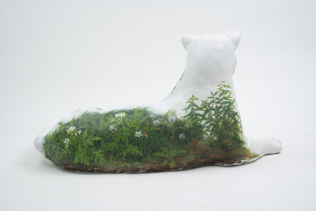 EPÍGRAFE DE LA OBRA: EN ALGÚN RINCÓN DE LA SELVA PARAGUAYA REPOSA UN YAGUARETÉ BLANCO E INVITA AL YUYAL A ENCARNARSE SOBRE SÍ MISMO COMO ESPEJO DE SU HÁBITAT NATURAL. ASÍ CUBRE SU PIEL LA FLOR AMARILLA DE CARDOSANTO, HIERBA DE SANTA LUCÍA CON SU FLOR AZUL, PEQUEÑA GRANDULARIA, DELICADOS LIRIOS YNAMBÚ CEVOI, ESPINA COLORADA O SOLANUN SISYMBRIIFOLIUM, DIENTE DE LEÓN CON SUS SEMILLAS Y LAS HOJAS DEL PARA PARA´I.