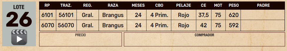 LOTE 26, TOROS BRANGUS 24 MESES Lote Anterior Volver al remate Lote Siguiente Ficha Contacto Ofertar Presidente Hayes - Ficha del Lote Identificador: #337831 Cantidad: 2 Categoría: Toros Edad: 24 MESES Pedigree Plazo 12 cuotas Raza BRANGUS Información Genética RP 6101 RP 6101 CIRCUNFERENCIA ESCROTAL 37.5 PESO ACTUAL 620 PRECIO BASE 1300000.00 MOT 75 RP 6070 RP 6070 CIRCUNFERENCIA ESCROTAL 42 PESO ACTUAL 592 PRECIO BASE 1300000.00 MOT 75 Presidente Hayes - Ofertar Aún no tiene ofertas Animales: 6101 6070 Plazo: Contado 30 días 45 días 60 días 90 días 120 días 180 días 2 Cuotas (30 y 60 días) 3 Cuotas (30, 60 y 90 días) 4 Cuotas (30,60,90 y 120 días) Su Oferta en Gs: (por 12 cuotas) − + Step: -5,00 / +5,00 Programar puja hasta: Programar puja hasta Aumentar puja programada 1300000.02 1300000.2 Iniciar sesión para ofertar Ofertar Detalle de la compra Cargando... Precio unitario: Precio Total: Comisión: Financiador: Total: Ofertas Recibidas Gs Fecha/Hora Estado Este lote aún no tiene preofertas. 11 Visualizaciones ClicData Contacto Empresa: Sola Marca SA Nombre*: Teléfono* : E-mail* : Mensaje Por informes y consultas +595981756870 Enviar