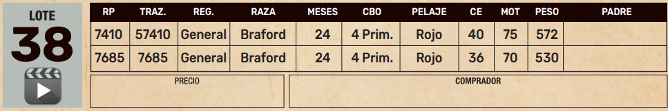 LOTE 38, TOROS BRAFORD 24 MESES 🔥 🔥 🔥 Lote Anterior Volver al remate Lote Siguiente Ficha Contacto Ofertar Presidente Hayes - Ficha del Lote Identificador: #337843 Cantidad: 2 Categoría: Toros Edad: 24 MESES Pedigree Plazo 12 cuotas Raza BRAFORD Información Genética RP 7410 RP 7410 CIRCUNFERENCIA ESCROTAL 40 PESO ACTUAL 572 PRECIO BASE 1200000.00 MOT 75 RP 7685 RP 7685 CIRCUNFERENCIA ESCROTAL 36 PESO ACTUAL 530 PRECIO BASE 1200000.00 MOT 70 Presidente Hayes - Ofertar Aún no tiene ofertas Animales: 7410 7685 Plazo: Contado 30 días 45 días 60 días 90 días 120 días 180 días 2 Cuotas (30 y 60 días) 3 Cuotas (30, 60 y 90 días) 4 Cuotas (30,60,90 y 120 días) Su Oferta en Gs: (por 12 cuotas) − + Step: -50.000,00 / +50.000,00 Programar puja hasta: Programar puja hasta Aumentar puja programada 1300000 2200000 Iniciar sesión para ofertar Ofertar Compra por Gs 99.000.000 Detalle de la compra Cargando... Precio unitario: Precio Total: Comisión: Financiador: Total: Ofertas Recibidas Gs Fecha/Hora Estado Este lote aún no tiene preofertas. ¿Estás seguro de comprar el LOTE TOROS BRAFORD 24 MESES por 12 cuotas de Gs 99000000 ? 20 Visualizaciones ClicData Contacto Empresa: Sola Marca SA Nombre*: Teléfono* : E-mail* : Mensaje Por informes y consultas +595981756870 Enviar