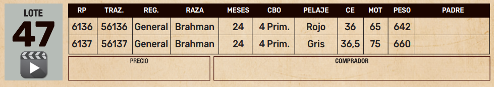 LOTE 47, TOROS BRAHMAN 24 MESES Lote Anterior Volver al remate Lote Siguiente Ficha Contacto Ofertar Presidente Hayes - Ficha del Lote Identificador: #337852 Cantidad: 2 Categoría: Toros Edad: 24 MESES Pedigree Plazo 12 cuotas Raza BRAHMAN Información Genética RP 6136 RP 6136 CIRCUNFERENCIA ESCROTAL 36 PESO ACTUAL 642 PRECIO BASE 1100000.00 MOT 65 RP 6137 RP 6137 CIRCUNFERENCIA ESCROTAL 36.5 PESO ACTUAL 660 PRECIO BASE 1100000.00 MOT 75 Presidente Hayes - Ofertar Aún no tiene ofertas Animales: 6136 6137 Plazo: Contado 30 días 45 días 60 días 90 días 120 días 180 días 2 Cuotas (30 y 60 días) 3 Cuotas (30, 60 y 90 días) 4 Cuotas (30,60,90 y 120 días) Su Oferta en Gs: (por 12 cuotas) − + Step: -50.000,00 / +50.000,00 Programar puja hasta: Programar puja hasta Aumentar puja programada 1200000 2100000 Iniciar sesión para ofertar Ofertar Compra por Gs 99.000.000 Detalle de la compra Cargando... Precio unitario: Precio Total: Comisión: Financiador: Total: Ofertas Recibidas Gs Fecha/Hora Estado Este lote aún no tiene preofertas. ¿Estás seguro de comprar el LOTE TOROS BRAHMAN 24 MESES por 12 cuotas de Gs 99000000 ? 10 Visualizaciones ClicData Contacto Empresa: Sola Marca SA Nombre*: Teléfono* : E-mail* : Mensaje Por informes y consultas +595981756870 Enviar