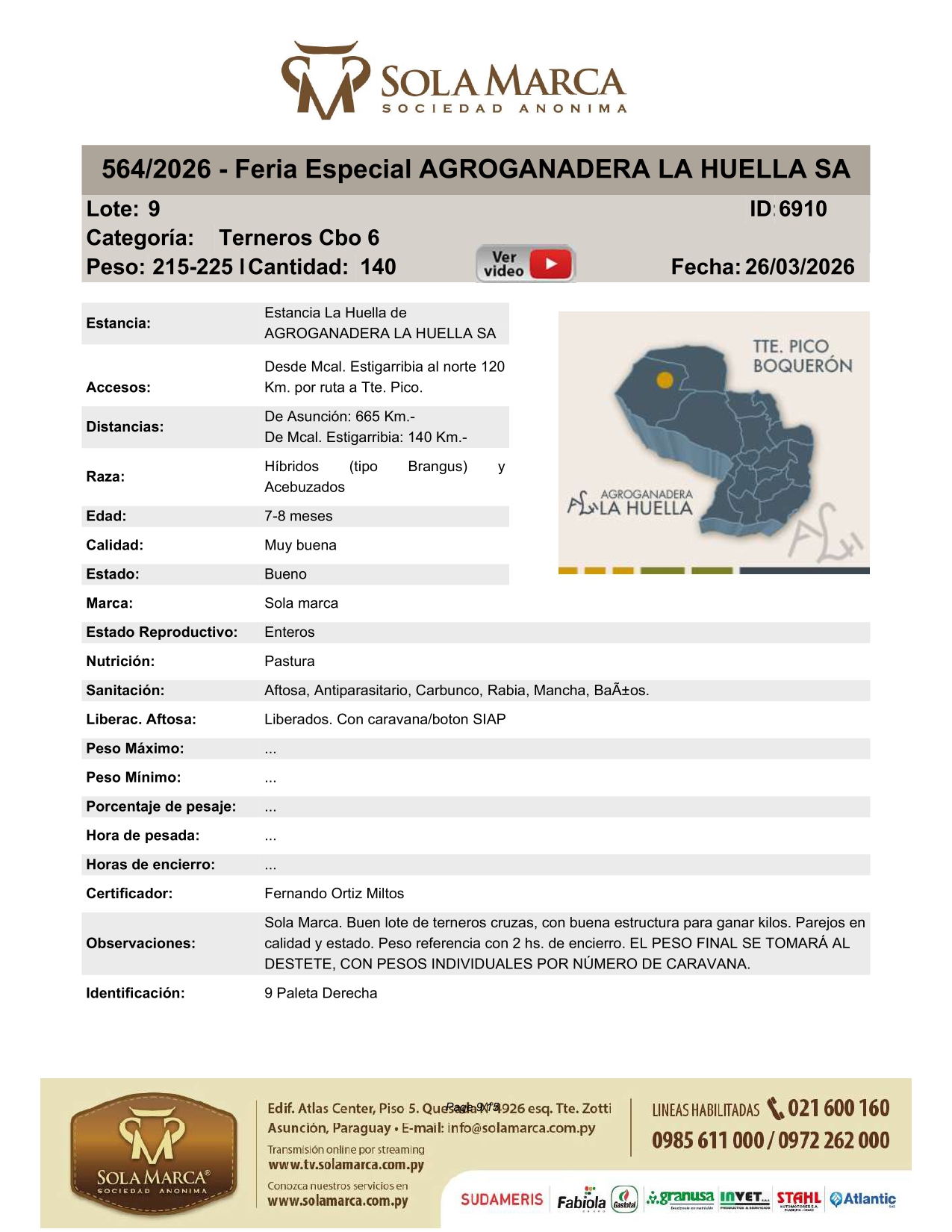 LOTE 9, Lote 9 Lote Anterior Volver al remate Lote Siguiente Ficha Contacto Ofertar Boquerón - Ficha del Lote Identificador: #365558 Cantidad: 140 Categoría: Terneros Cbo 6 Pedigree Ofertar Fecha de cierre: 11 de Abril a las 16:00hs. Aún no tiene ofertas Plazo: Contado 30 días 45 días 60 días 90 días 120 días 180 días 2 Cuotas (30 y 60 días) 3 Cuotas (30, 60 y 90 días) 4 Cuotas (30,60,90 y 120 días) Su Oferta en Gs: − + Step: -100,00 / +100,00 Programar puja hasta: Programar puja hasta Aumentar puja programada 24200 26000 **Oferta al kg Iniciar sesión para ofertar Ofertar Compra por Gs 99.000.000 Ofertas Recibidas Gs Fecha/Hora Estado Este lote aún no tiene preofertas. ¿Estás seguro de comprar el Lote 9 por Gs 99000000 ? 1 Visualizaciones ClicData Contacto Empresa: Sola Marca SA Nombre*: Teléfono* : E-mail* : Mensaje Por informes y consultas +595981756870 Enviar Registrese gratis Este contenido Exclusivo está disponible sólo para usuarios registrados Ingresar