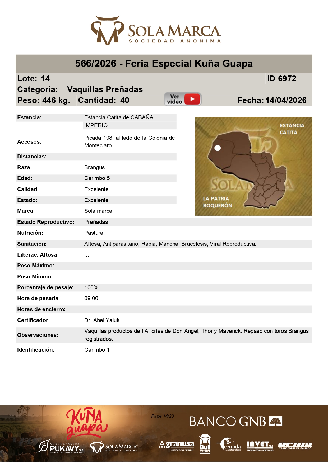 LOTE 14, Vaquillas Preñadas Lote Anterior Volver al remate Lote Siguiente Ficha Contacto Ofertar Boquerón - Ficha del Lote Identificador: #367501 Cantidad: 40 Categoría: Vaquillas Preñadas Peso: 446Kg. Pedigree Establecimiento Estancia Catita de CABAÑA IMPERIO Boquerón - Ofertar Fecha de cierre: 21 de Abril a las 18:00hs. Aún no tiene ofertas Plazo: Contado 30 días 45 días 60 días 90 días 120 días 180 días 2 Cuotas (30 y 60 días) 3 Cuotas (30, 60 y 90 días) 4 Cuotas (30,60,90 y 120 días) Su Oferta en Gs: − + Step: -20.000,00 / +20.000,00 Programar puja hasta: Programar puja hasta Aumentar puja programada 1380000 1740000 **Oferta por punta Iniciar sesión para ofertar Ofertar Compra por Gs 99.000.000 Ofertas Recibidas Gs Fecha/Hora Estado Este lote aún no tiene preofertas. ¿Estás seguro de comprar el LOTE Vaquillas Preñadas por Gs 99000000 ? 2 Visualizaciones ClicData Contacto Empresa: Sola Marca SA Nombre*: Teléfono* : E-mail* : Mensaje Por informes y consultas +595981756870 Enviar Registrese gratis Este contenido Exclusivo está disponible sólo para usuarios registrados Ingresar